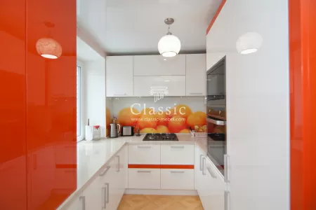 В качестве рабочей поверхности кухонной мебели заказчик из Санкт-Петербурга избрал прекрасную столешницу из искусственного камня светлого оттенка, а также встроенную мойку, которая составляет со столешницей единое целое.