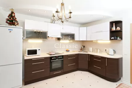 В дизайн кухни на выбор включена необычная барная стойка сложной конфигурации. Искусственный камень, из которого выполнено изделие, позволяет придать ей эстетичный вид. Одним концом стойка проходит над рабочей поверхностью, опираясь на декоративные держатели – пилоны. Другим концом, заворачивая, устанавливается на опору. Сама опора также выполнена из искусственного камня с двухсторонним покрытием. Цвет барной стойки является контрастным по отношению к основной столешнице, но родственным – по отношению к фасадам нижних тумб. Выбирая мебель на заказ, Вы можете создать неповторимый проект, который прекрасно впишется в дизайн Вашего индивидуального интерьера.