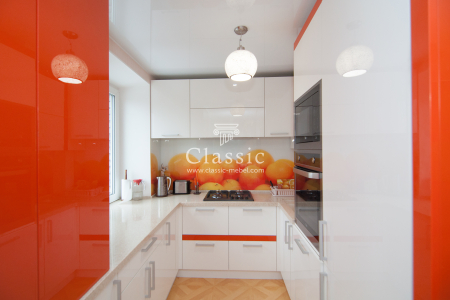 Помещение на фото оформлено весьма бесхитростно, в спокойных тонах, поэтому, при выборе материалов для кухни на заказ было важно, чтобы она стала ярким акцентом. Для гарнитура в стиле Модерн прекрасным вариантом станут фасады из современного пластика «Акрилайн». Его высокоглянцевая поверхность имеет насыщенные оттенки, актуальные в современном дизайне кухонь. Кроме того, «Акрилайн» позволяет с блеском решить основную проблему пластиков – подбор подходящей кромки. Известно, что пластиковые фасады выпускаются листами, поэтому важно продумать обработку торцов. Это может быть алюминиевая рамка, что очень надежно и своеобразно, либо кромка (акрил, ПВХ, ABS). Для многих пластиков выбор кромки для торца становится проблемой, так как точно подобрать ее к основному оттенку полотна становится практически невозможным. Производители пластика «Акрилайн» предлагают акриловую кромку полностью соответствующую тону самих фасадов. Таким образом, дверки будут смотреться единым целым, при этом, их яркий насыщенный оттенок будет радовать глаз. Существуют специальные средства по уходу за подобными дверками. Но, в целом, пластиковые фасады гораздо более устойчивы к агрессивным воздействиям внешней среды и практически не подвержены отслоению по сравнению с пленочными дверками.