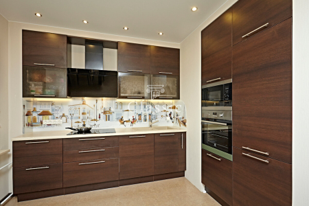 Столешница кухни — очень важная составляющая любого кухонного гарнитура. В нашей компании у каждого клиента есть возможность подобрать для своей дешевой кухни именно ту столешницу, которую он захочет. Столешница и стеновые панели этой дешевой кухни — германского производства. Основа столешницы — древесностружечная плита, верхняя поверхность которой оклеена слоистым пластиком. Декор столешницы — «венге». Этот современный благородный цвет с золотистым отливом с четким рисунком и при этом достаточно теплый придает дешевой кухне красивый внешний вид, а кухонное помещение наполняют удобством и комфортом. Толщина столешницы 38мм. По периметру кухонная столешница обработана кромкой ПВХ Magik, которая с успехом используется для облицовки столов или различных стоек, столешниц, кухонных фасадов. Это кромка из прозрачного полимерного материала с алюминиевой вставкой отличается своим благородством и эксклюзивностью дизайна. Она снижает возможность проникновения влаги в саму столешницу.