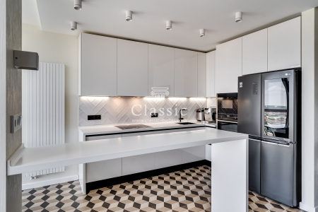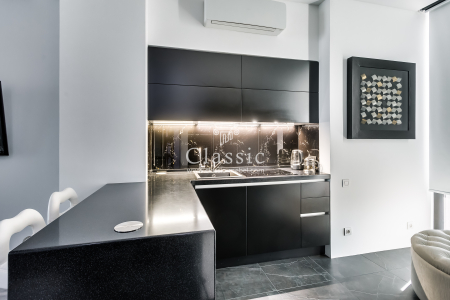 В левом крыле также предусмотрены вместительные пеналы, но они выполнены в темном оттенке, в цвет тумб. В одном из них также предусмотрены выдвижные внутренние тандембоксы. В другом шкафу дизайнер Классик предложил поместить стильную бытовую технику цвета «нержавеющая сталь», которая прекрасно дополняет кухню дизайна Модерн. Встраиваемая СВЧ-печь расположена непосредственно над духовкой, что смотрится своеобразно, но не противоречит технологическим допускам в проектировании кухни. В верхней и нижней части предусмотрены глухие дверки темного оттенка, за которыми заказчица может расположить продукты и кухонную утварь. Верхние полки умело продолжают рисунок шкафов. Интересно отметить, что полки расположены вдоль одной стены. Вторая стена кухни на заказ оставлена свободной. Там хозяйка может расположить своеобразный кухонный телевизор. Мебель на заказ предполагает учет разнообразных модных тенденций и современных технологий при планировании кухни. Так, хозяева отказались от варианта установки стеновой панели для кухонного гарнитура, они предпочли оштукатурить стены. Но для дополнительной защиты фартука от загрязнений, установили панель из бесцветного закаленного стекла. Места креплений стекла планируются заранее, до того, как стекло попадет в печь. Это важно, так как закаленное стекло не поддается дополнительной механической обработке. Оно устанавливается в готовом виде. Поэтому дизайнер Классик уделит планированию стекла особое внимание и предупредит заказчиков, что стекло изготавливается и устанавливается только после монтажа кухонного гарнитура.