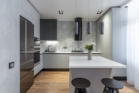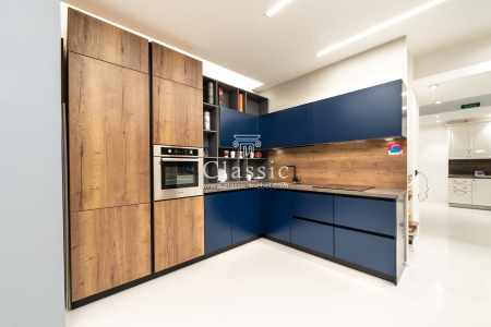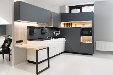 Материалы кухонного гарнитура на фото подобраны со вкусом. Хозяевам удалось четко спланировать оформление интерьера. Просторная кухня-студия дает возможность разграничить зоны в помещении. Обеденная зона кухни оформлена в более светлых тонах. В помещении присутствуют ниши в стене, поэтому в задачу дизайнера Классик входило спланировать мебель таким образом, чтобы все нюансы кухни удачно дополнили друг друга.